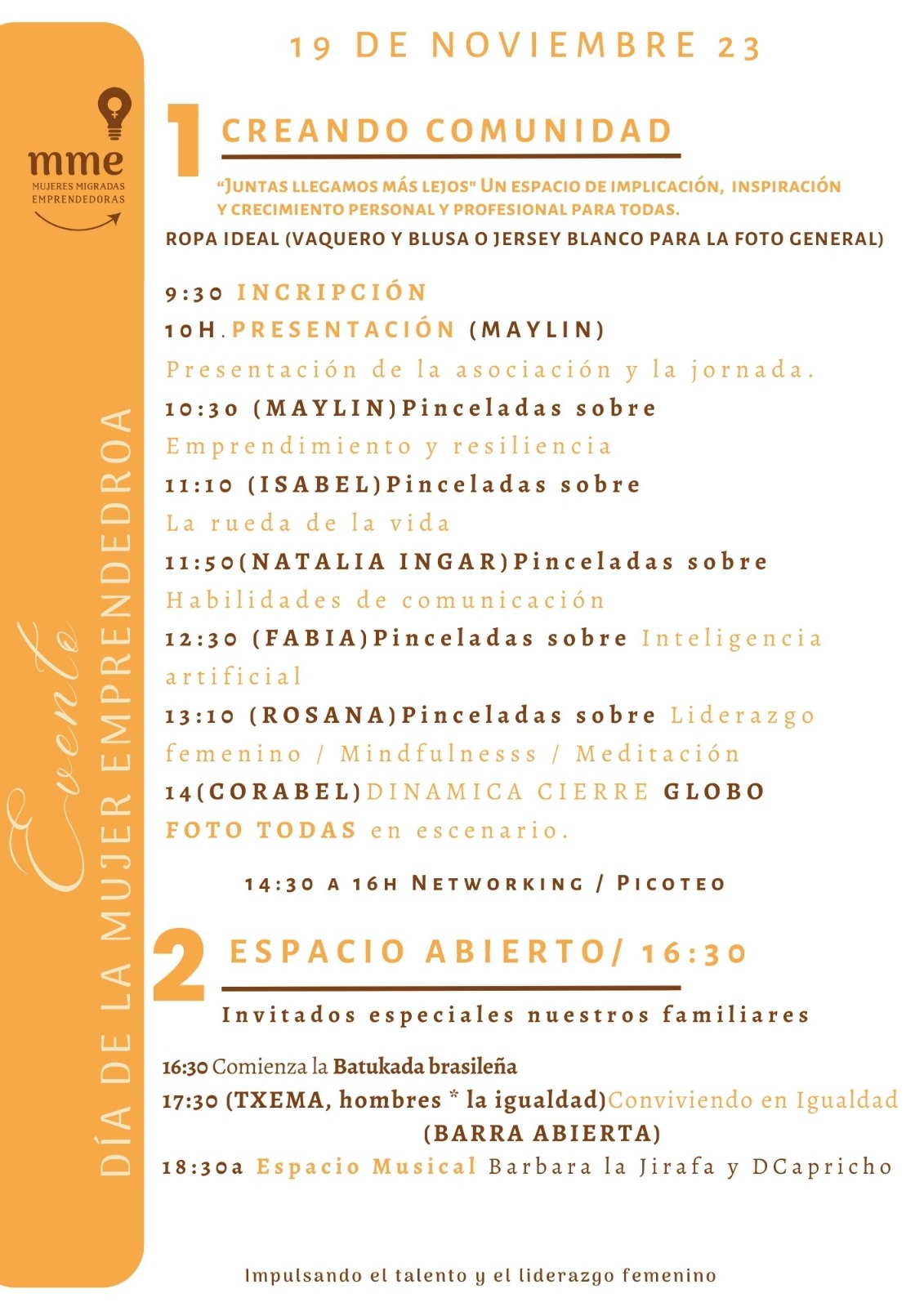 Celebraremos nuestro día compartiendo, intercambiando y expandiendo nuestro *liderazgo y crecimiento personal y profesional*.  Un espacio de *implicación, inspiración y crecimiento personal y profesional para todas*. *Creando COMUNIDAD*